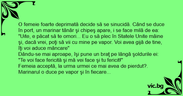 Femeia acceptă, la urma urmei ce mai avea de pierdut?. Marinarul o duce pe vapor şi în fiecare seară îi aducea sandwich-uri şi fructe şi făceau dragoste până dimineaţa. Trei săptămâni mai târziu, în timpul unui unui control de rutină, căpitanul descoperă femeia într-o cabină: