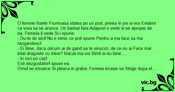 O femeie foarte Frumoasa statea pe un pod, privea in jos si era Evident ca vrea sa se arunce. Un barbat fara Adapost o vede si se apropie de ea. Femeia il vede Si-i spune: