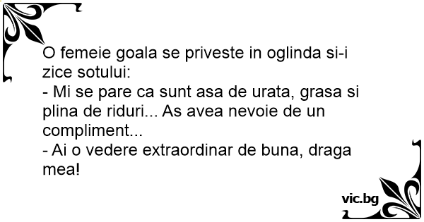O femeie goala se priveste in oglinda si-i zice sotului: