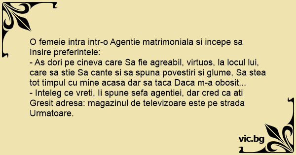 O femeie intra intr-o Agentie matrimoniala si incepe sa Insire preferintele: