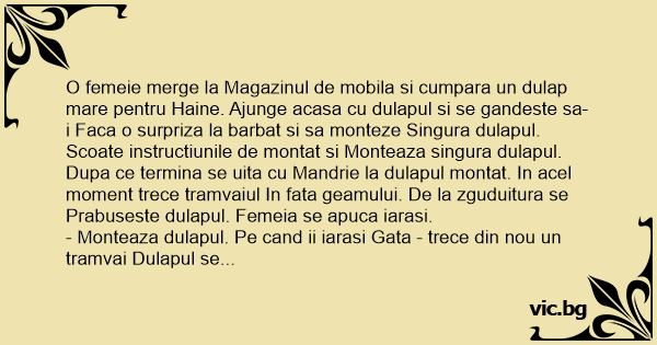 O femeie merge la Magazinul de mobila si cumpara un dulap mare pentru Haine. Ajunge acasa cu dulapul si se gandeste sa-i Faca o surpriza la barbat si sa monteze Singura dulapul. Scoate instructiunile de montat si Monteaza singura dulapul. Dupa ce termina se uita cu Mandrie la dulapul montat. In acel moment trece tramvaiul In fata geamului. De la zguduitura se Prabuseste dulapul. Femeia se apuca iarasi.