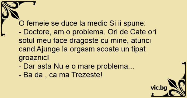 - Doctore, am o problema. Ori de Cate ori sotul meu face dragoste cu mine, atunci cand Ajunge la оrgаsм scoate un tipat groaznic!