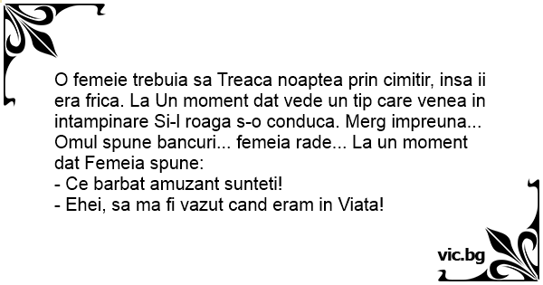 O femeie trebuia sa Treaca noaptea prin cimitir, insa ii era frica. La Un moment dat vede un tip care venea in intampinare Si-l roaga s-o conduca. Merg impreuna...