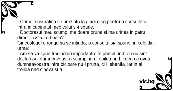 O femeie usuratica se prezinta la ginecolog pentru o consultatie. Intra in cabinetul medicului si-i spune:
