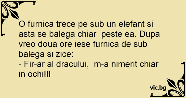 O furnica trece pe sub un elefant si asta se balega chiar peste ea. Dupa vreo doua ore iese furnica de sub balega si zice: