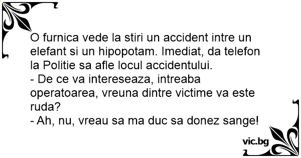 O furnica vede la stiri un accident intre un elefant si un hipopotam. Imediat, da telefon la Politie sa afle locul accidentului.