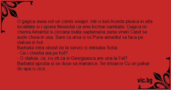 O gagica avea sot un comis voiajor. Intr-o luni Acesta pleaca in alta localitate si-i spune Nevestei ca vine tocmai sambata. Gagica isi chema Amantul si ciocane toata saptamana pana vineri Cand se aude cheia in usa. Sare ca arsa si isi Pune amantul sa faca pe statuia in hol.