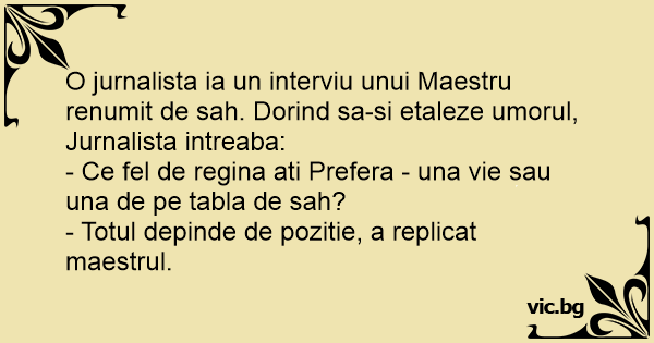 O jurnalista ia un interviu unui Maestru renumit de sah. Dorind sa-si etaleze umorul, Jurnalista intreaba: