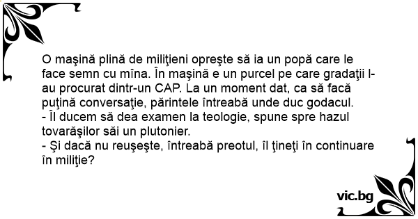 - Îl ducem să dea examen la teologie, spune spre hazul tovarăşilor săi un plutonier.