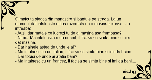 O maicuta pleaca din manastire si bantuie pe strada. La un moment dat intalneste o tipa rezemata de o masina luxoasa si o intreaba: