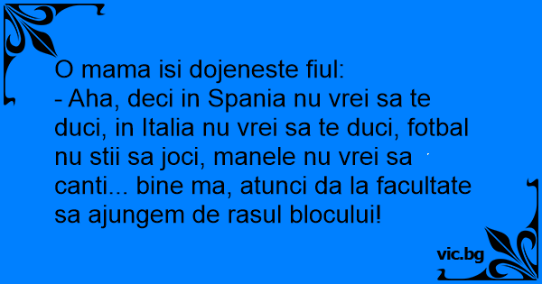 - Aha, deci in Spania nu vrei sa te duci, in Italia nu vrei sa te duci, fotbal nu stii sa joci, manele nu vrei sa canti... bine ma, atunci da la facultate sa ajungem de rasul blocului!