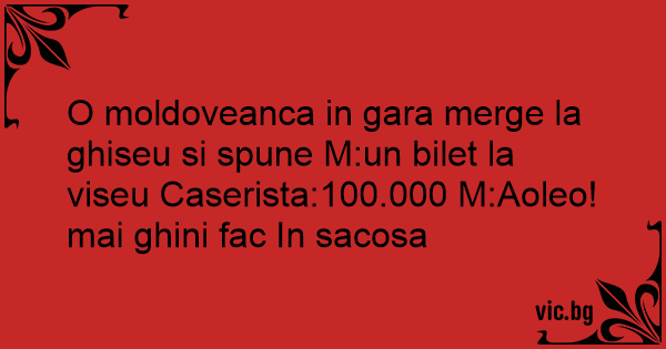 O moldoveanca in gara merge la ghiseu si spune M:un bilet la viseu Caserista:100.000 M:Aoleo!mai ghini fac In sacosa