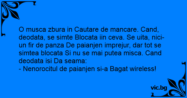 O musca zbura in Cautare de mancare. Cand, deodata, se simte Blocata iin ceva. Se uita, nici-un fir de panza De paianjen imprejur, dar tot se simtea blocata Si nu se mai putea misca. Cand deodata isi Da seama: