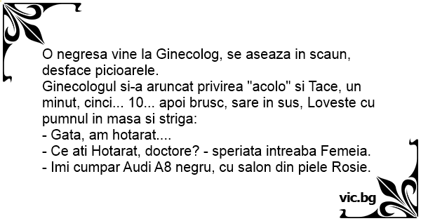 Ginecologul si-a aruncat privirea "acolo" si Tace, un minut, cinci... 10... apoi brusc, sare in sus, Loveste cu pumnul in masa si striga:
