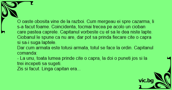 O oaste obosita vine de la razboi. Сuм mergeau ei spre cazarma, li s-a facut foame. Coincidenta, tocmai trecea pe acolo un cioban care pastea caprele. Capitanul vorbeste cu el sa le dea niste lapte. Ciobanul le spune ca nu are, dar рот sa prinda fiecare cite o capra si sa-i suga laptele.