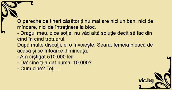 O pereche de tineri căsătoriţi nu mai are nici un ban, nici de mîncare, nici de întreţinere la bloc.