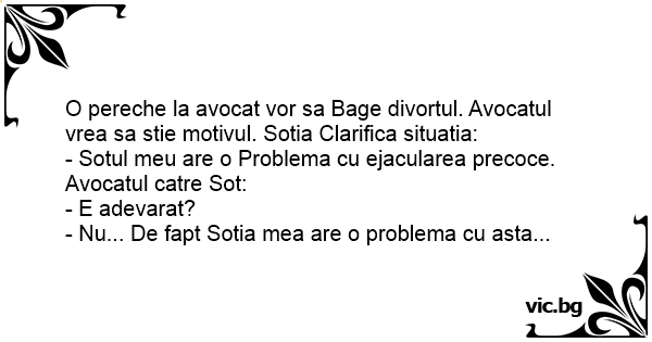 O pereche la avocat vor sa Bage divortul. Avocatul vrea sa stie motivul. Sotia Clarifica situatia: