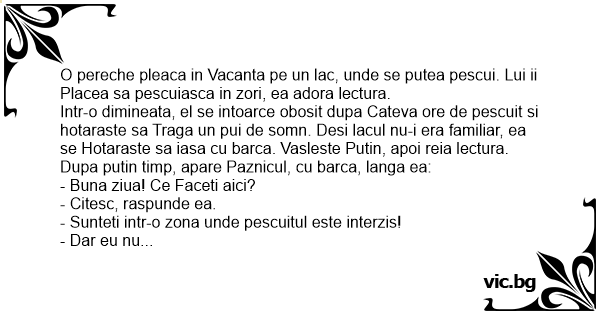 O pereche pleaca in Vacanta pe un lac, unde se putea pescui. Lui ii Placea sa pescuiasca in zori, ea adora lectura.