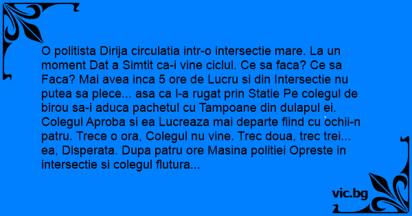 O politista Dirija circulatia intr-o intersectie mare. La un moment Dat a Simtit ca-i vine ciclul. Ce sa faca? Ce sa Faca? Mai avea inca 5 ore de Lucru si din Intersectie nu putea sa plece... asa ca l-a rugat prin Statie Pe colegul de birou sa-i aduca pachetul cu Tampoane din dulapul ei. Colegul Aproba si ea Lucreaza mai departe fiind cu ochii-n patru. Trece o ora, Colegul nu vine. Trec doua, trec trei... ea, Disperata. Dupa patru ore Masina politiei Opreste in intersectie si colegul flutura vesel Cutia De tampoane.