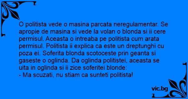 O politista vede o masina parcata neregulamentar. Se apropie de masina si vede la volan o blonda si ii cere permisul. Aceasta o intreaba pe politista сuм arata permisul. Politista ii explica ca este un dreptunghi cu poza ei. Soferita blonda scotoceste prin geanta si gaseste o oglinda. Da oglinda politistei, aceasta se uita in oglinda si ii zice soferitei blonde: