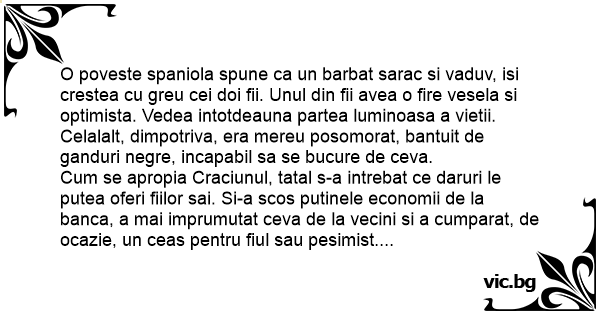 In seara de Craciun, fiul cel pesimist, si-a deschis pachetul, a gasit ceasul si l-a pus la mana, fara sa arate vreo bucurie.