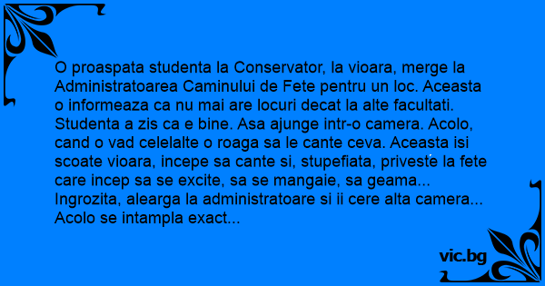 O proaspata studenta la Conservator, la vioara, merge la Administratoarea Caminului de Fete pentru un loc. Aceasta o informeaza ca nu mai are locuri decat la alte facultati. Studenta a zis ca e bine. Asa ajunge intr-o camera. Acolo, cand o vad celelalte o roaga sa le cante ceva. Aceasta isi scoate vioara, incepe sa cante si, stupefiata, priveste la fete care incep sa se excite, sa se mangaie, sa geama... Ingrozita, alearga la administratoare si ii cere alta camera...