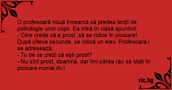 O profesoară nouă încearcă să predea lecţii de psihologie unor copii. Ea intră în clasă spunînd: