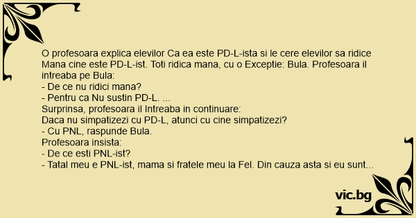 O profesoara explica elevilor Ca ea este PD-L-ista si le cere elevilor sa ridice Mana cine este PD-L-ist. Toti ridica mana, cu o Exceptie: Bula. Profesoara il intreaba pe Bula: