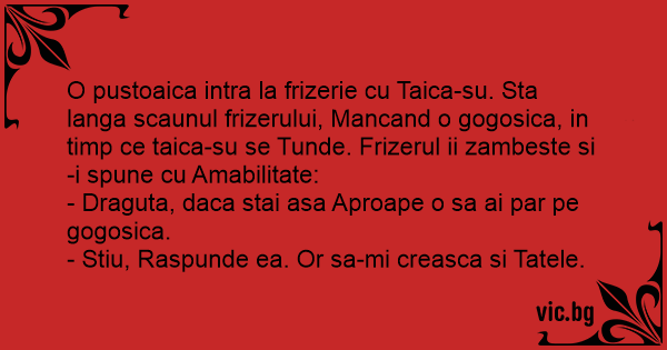 O pustoaica intra la frizerie cu Taica-su. Sta langa scaunul frizerului, Mancand o gogosica, in timp ce taica-su se Tunde. Frizerul ii zambeste si-i spune cu Amabilitate: