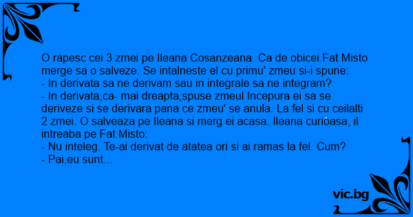 - In derivata,ca- mai dreapta,spuse zmeul Incepura ei sa se deriveze si se derivara pana ce zmeu' se anula. La fel si cu ceilalti 2 zmei. O salveaza pe Ileana si merg ei acasa. Ileana curioasa, il intreaba pe Fат Misto: