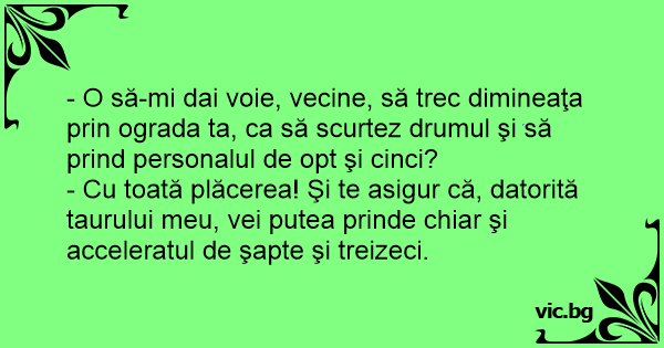 - O să-mi dai voie, vecine, să trec dimineaţa prin ograda ta, ca să scurtez drumul şi să prind personalul de opt şi cinci?<br />- Cu toată plăcerea! Şi te asigur că, datorită taurului meu, vei putea prinde chiar şi acceleratul de şapte şi treizeci.
