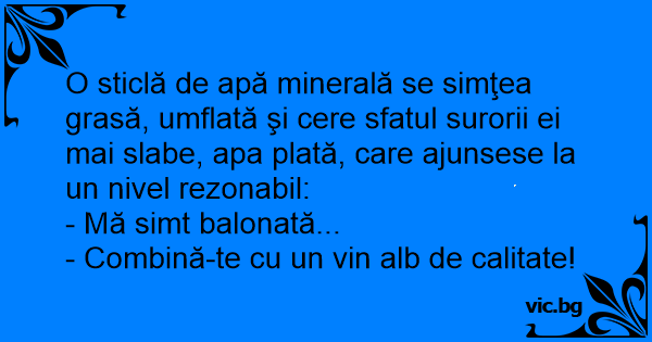 O sticlă de apă minerală se simţea grasă, umflată şi cere sfatul surorii ei mai slabe, apa plată, care ajunsese la un nivel rezonabil: