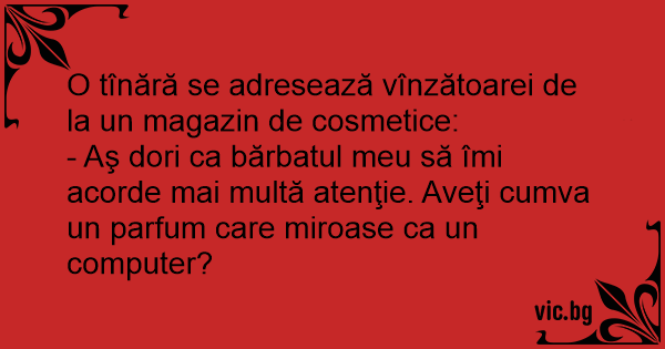- Aş dori ca bărbatul meu să îmi acorde mai multă atenţie. Aveţi cumva un parfum care miroase ca un computer?