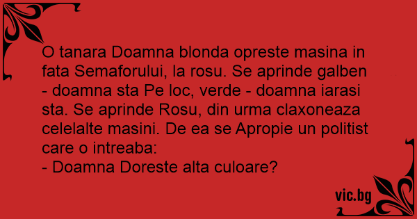 O tanara Doamna blonda opreste masina in fata Semaforului, la rosu. Se aprinde galben - doamna sta Pe loc, verde - doamna iarasi sta. Se aprinde Rosu, din urma claxoneaza celelalte masini. De ea se Apropie un politist care o intreaba: