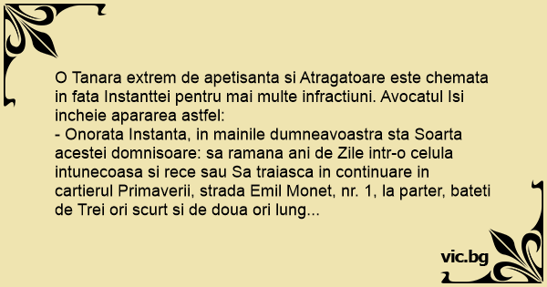 - Onorata Instanta, in mainile dumneavoastra sta Soarta acestei domnisoare: sa ramana ani de Zile intr-o celula intunecoasa si rece sau Sa traiasca in continuare in cartierul Primaverii, strada Emil Monet, nr. 1, la parter, bateti de Trei ori scurt si de doua ori lung...