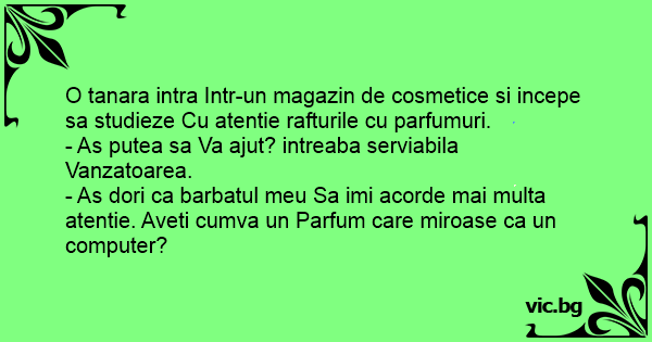 - As dori ca barbatul meu Sa imi acorde mai multa atentie. Aveti cumva un Parfum care miroase ca un computer?