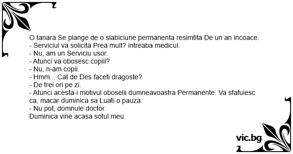 - Atunci acesta-i motivul oboselii dumneavoastra Permanente. Va sfatuiesc ca, macar duminica sa Luati o pauza.
