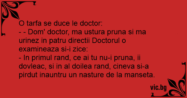 - - Dom' doctor, ma ustura pruna si ma urinez in patru directii Doctorul o examineaza si-i zice: