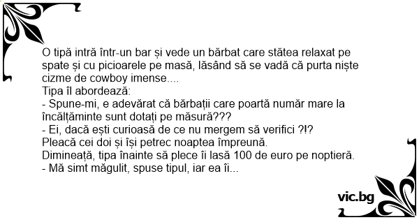 - Spune-mi, e adevărat că bărbații care poartă număr mare la încălțăminte sunt dotați pe măsură???