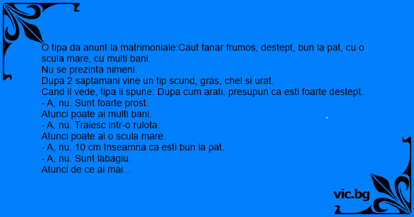 O tipa da anunt la matrimoniale:Caut tanar frumos, destept, bun la pat, cu o scula mare, cu multi bani.