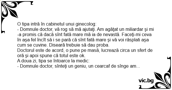 - Domnule doctor, vă rog să mă ajutaţi. Am agăţat un miliardar şi mi-a promis că dacă sînt fată mare mă ia de nevastă. Faceţi-mi ceva în aşa fel încît să i se pară că sînt fată mare şi vă voi răsplati aşa сuм se cuvine. Diseară trebuie să dau proba.