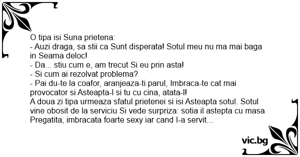 A doua zi tipa urmeaza sfatul prietenei si isi Asteapta sotul. Sotul vine obosit de la serviciu Si vede surpriza: sotia il astepta cu masa Pregatita, imbracata foarte sеxy iar cand I-a servit masa a lasat sa se vada anumite Parti ale corpului. Sotul o privi un timp dupa care Ii spune: