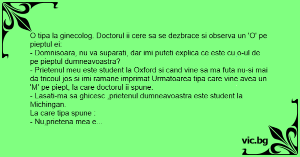 - Prietenul meu este student la Oxford si cand vine sa ma futa nu-si mai da tricoul jos si imi ramane imprimat Urmatoarea tipa care vine avea un 'M' pe piept, la care doctorul ii spune: