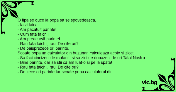 - De cinci ori parinte Iar scoate popa calculatorul din buzunar, calculeaza, calculeaza, calculeaza..... si zice:
