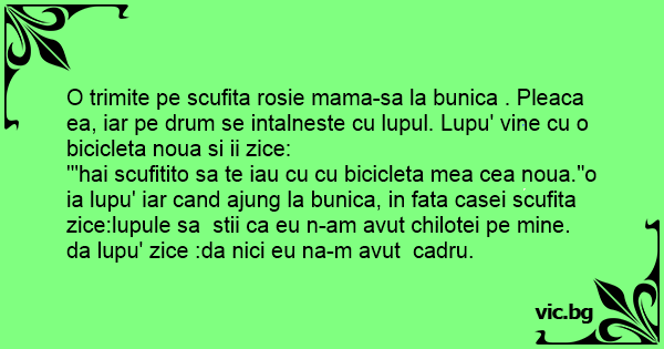 '"hai scufitito sa te iau cu cu bicicleta mea cea noua."o ia lupu' iar cand ajung la bunica, in fata casei scufita zice:lupule sa stii ca eu n-am avut chilotei pe mine. da lupu' zice :da nici eu na-m avut cadru.