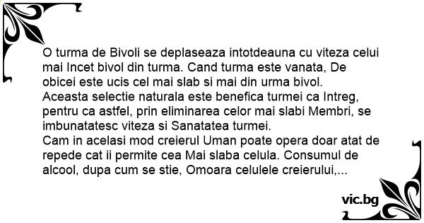O turma de Bivoli se deplaseaza intotdeauna cu viteza celui mai Incet bivol din turma. Cand turma este vanata, De obicei este ucis cel mai slab si mai din urma bivol.