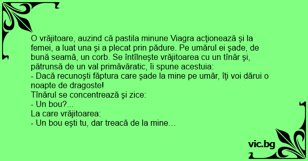O vrăjitoare, auzind că pastila minune Viаgrа acţionează şi la femei, a luat una şi a plecat prin pădure. Pe umărul ei şade, de bună seamă, un corb. Se întîlneşte vrăjitoarea cu un tînăr şi, pătrunsă de un val primăvăratic, îi spune acestuia: