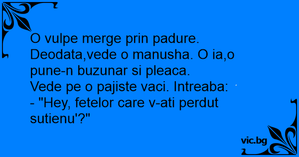 O vulpe merge prin padure. Deodata,vede o manusha. O ia,o pune-n buzunar si pleaca.