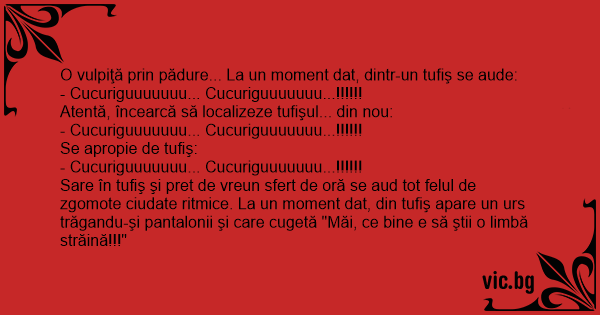 Sare în tufiş şi pret de vreun sfert de oră se aud tot felul de zgomote ciudate ritmice. La un moment dat, din tufiş apare un urs trăgandu-şi pantalonii şi care cugetă "Măi, ce bine e să ştii o limbă străină!!!"