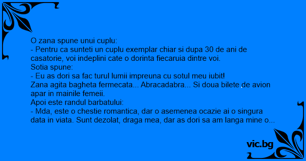 Sotia este deceptionata, zana se incrunta, dar dorinta e dorinta si ea trebuie indeplinita. Zana face un cerc cu bagheta magica... Abracadabra... Si deodata sotul are 90 de ani.